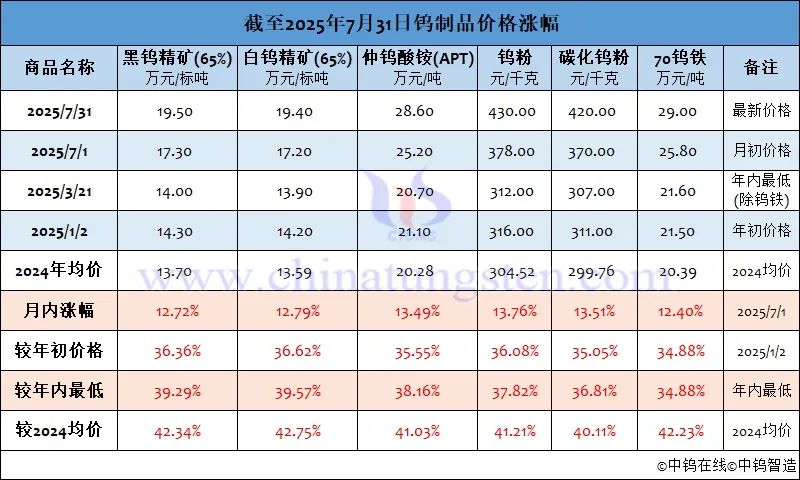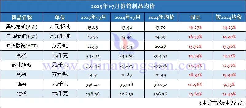 二、2025年7月份钨制品均价