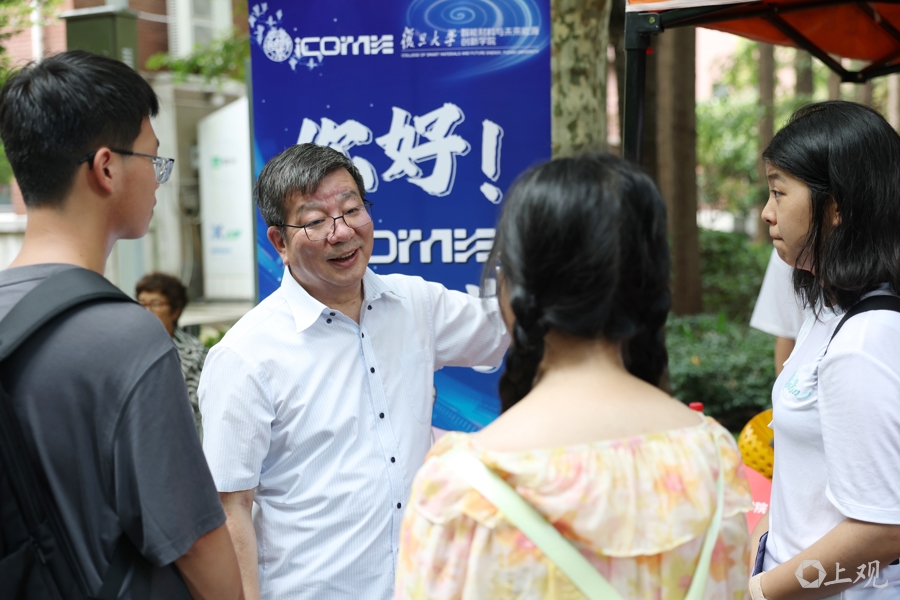 在智能材料与未来能源创新学院报到摊位前,该学院院长、中国科学院院士赵东元正和几位来报到的新生亲切交谈。